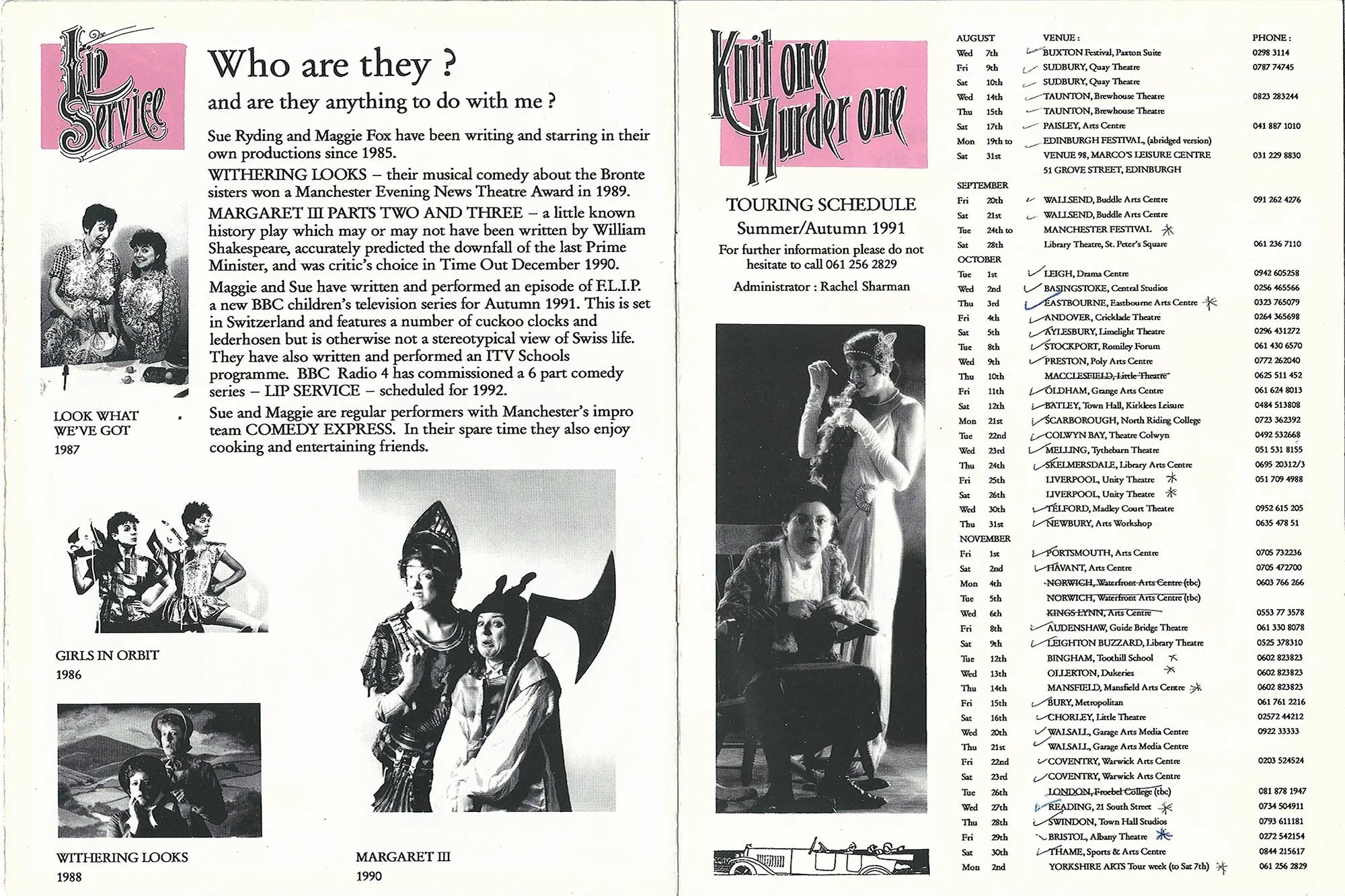 In Knit One Murder One, the murder weapon is a seed cake made by spinster sleuth Hilda Gibbings. During our tour of the show our stage manager had to buy a seed cake for every performance. Half an hour before going on stage at South Hill Park in Bracknell, the prop seed cake was ACTUALLY stolen. A gang of youths broke into the theatre and ate it. An emergency replacement was required and curtain up was a little late. The thieves also stole a maid’s hat and Sue actually cut up her own bra to stitch a last minute replacement. Bracknell eh?!”