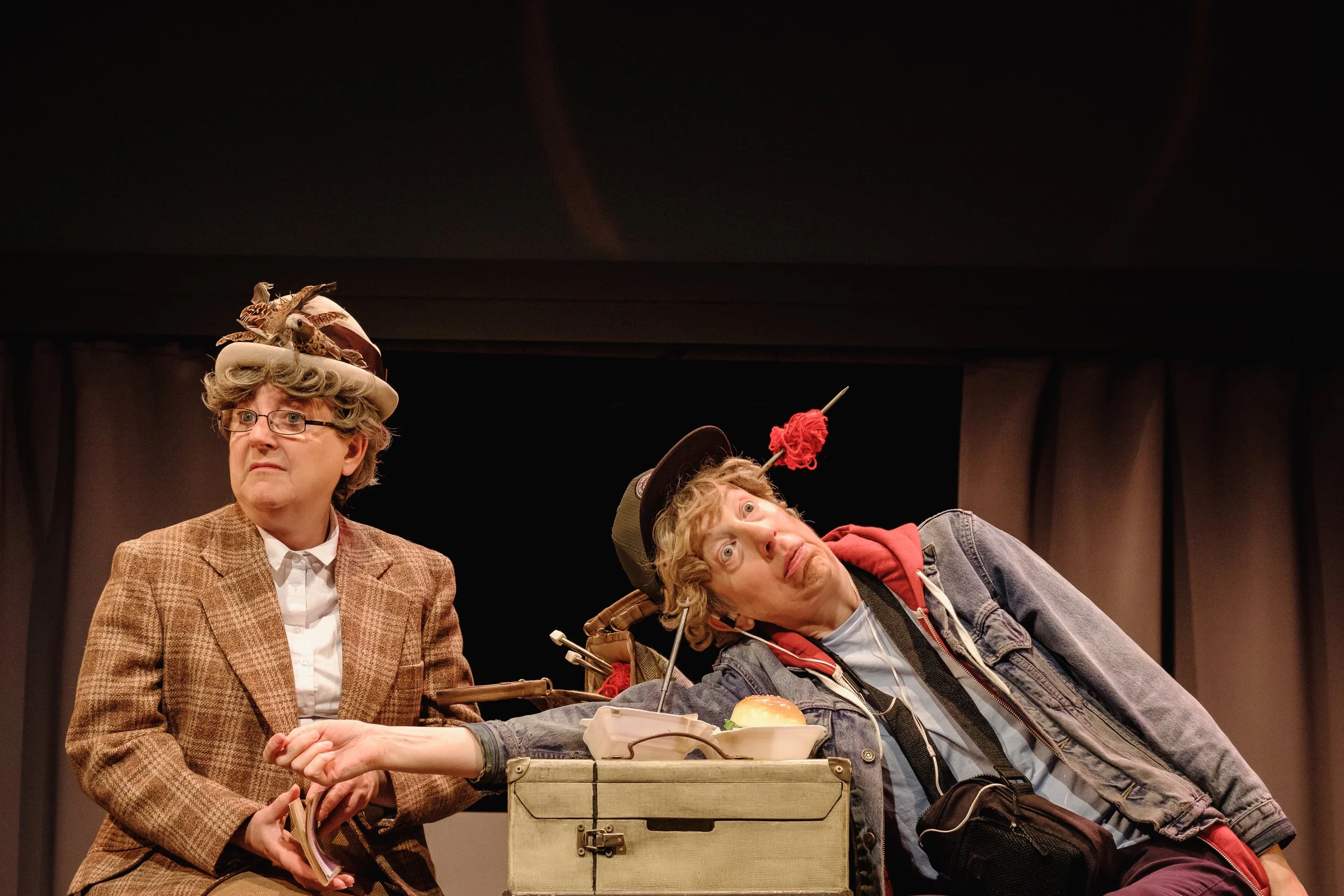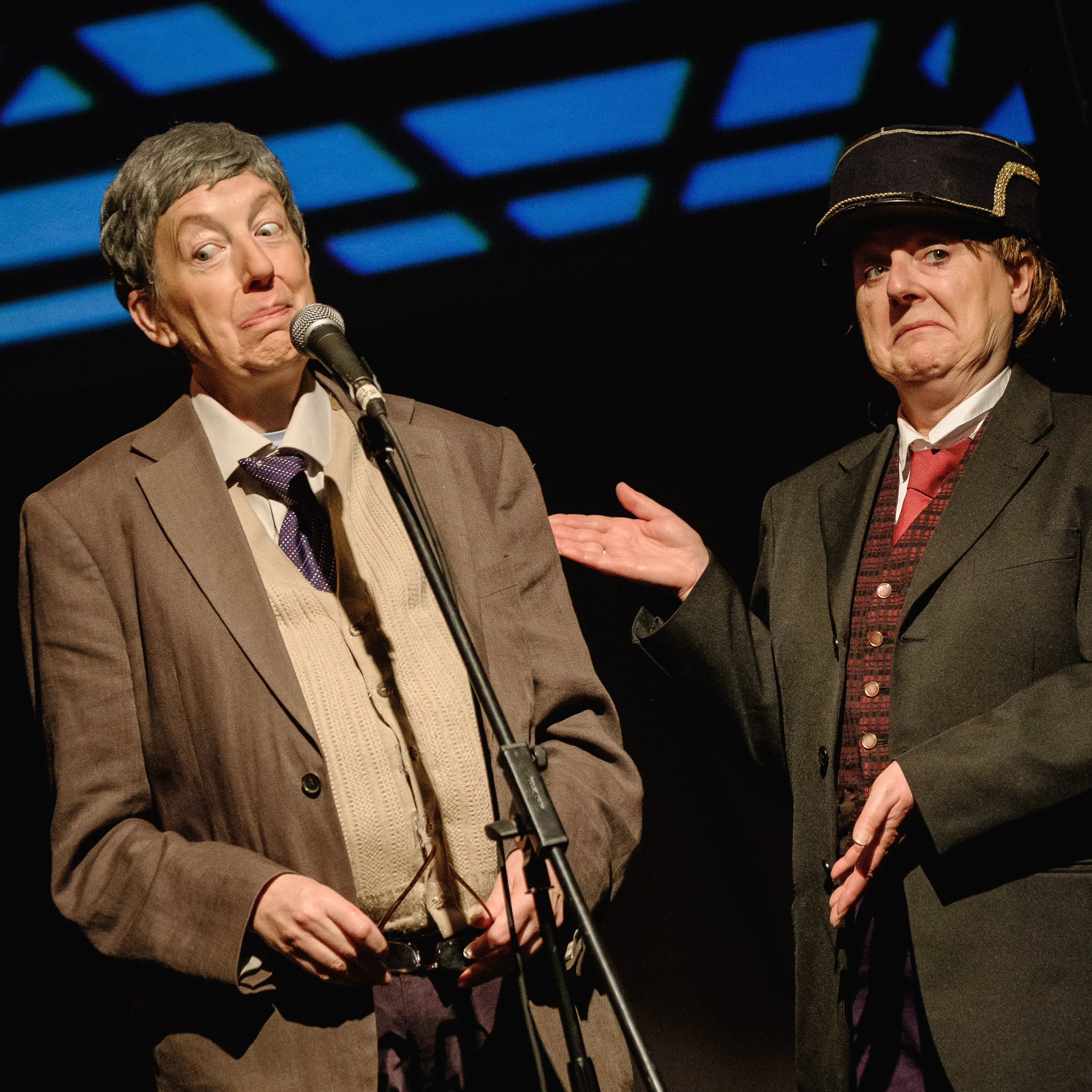 So we entered the world of men! We worked with 2 model railway societies, one in Sale and one in Heywood. We based the two main characters Derek and Geoff on some of the people we met, an affectionate send up of the train set obsessives. Towards the end of the tour Maggie told me she had signed us up to have a stand at the Xmas Model Railway Society Exhibition, a huge affair held in a Manchester convention centre. I couldn’t quite believe she’d done that. “Well, I suppose it’s only a day,” I said wearily. Maggie went very quiet and then said “It’s a weekend”. So we had a stand where a G gauge train ran the length of a table and a screen behind it played out scenes from our show. Throughout the weekend, hundreds of small children queued in line to make the train run the length of the table. They were forbidden from touching any of the more serious layouts in the show and were very bored. This was something to do. One little lad queued up repeatedly throughout the Saturday. His mother commented that our stand had been a life saver, she’d never seen him so happy. The central heating in the convention centre was turned up to about 30 and we had banging headaches through dehydration. By the end of the weekend the engine was covered in gunk from so much contact with sticky fingers. But a few people had taken a leaflet and said they would come to see the show. I bet they didn’t…..