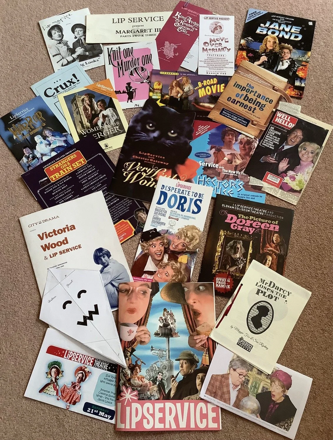 Following your invitation to send some memories of 40 years of LipService I am sending you a collage of all my programmes which I have collected of all - or at least a great many - of your productions right from „Girls in Orbit“ onwards. I was and am a big fan and introduced many of my friends to LipService over the years who all became fans, too. We all loved the variety, inventiveness and a certain „whackiness“ of LipService shows.
